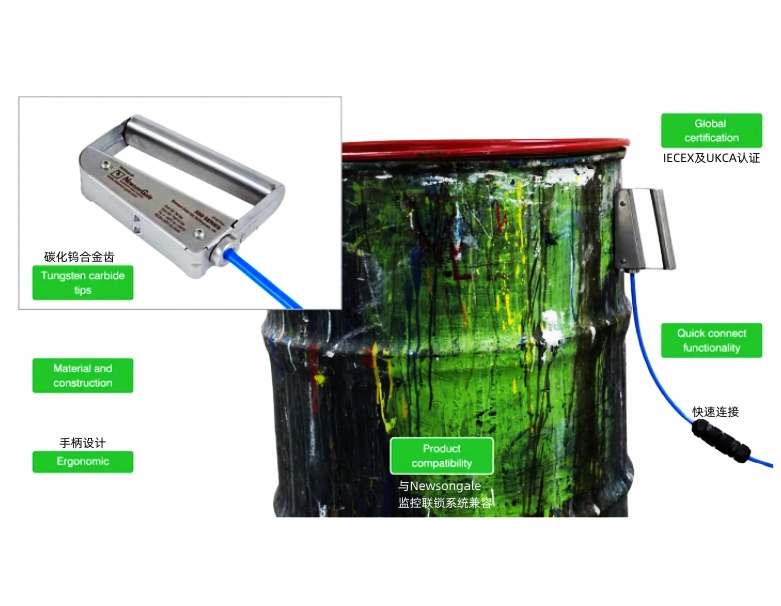 Newson Gale 设计的双极接地夹,利用磁力和碳化钨钳齿的力量,实 现了与任何黑色金属表面的稳健低电阻连接(≤10 欧姆),例如圆桶 、周转箱、中型散装容器 (IBC) 等。此时桶体得到填充,通过敞开的顶部使外盖合体到位,从而使黑色金属桶通过 VESX50-IP双极磁性接地夹实现接地。
