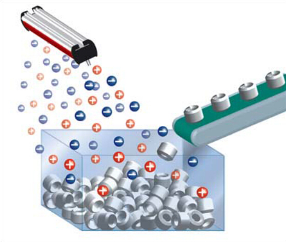 带有大量静电的小塑料部件堆积在料斗里,会吸附空气中的灰尘,并且造成静电电击。